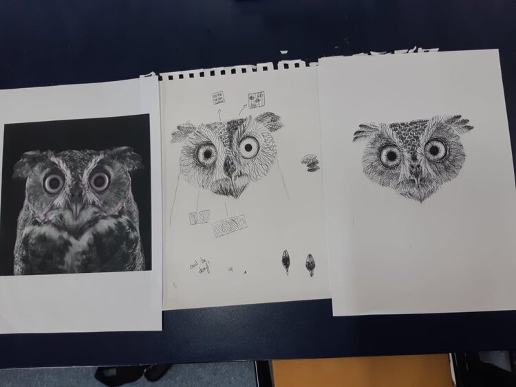 By referring to their bank of mark making samples, students applied their textures. Before they started some made mini samples of their texture on a separate page, some just went straight in.